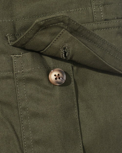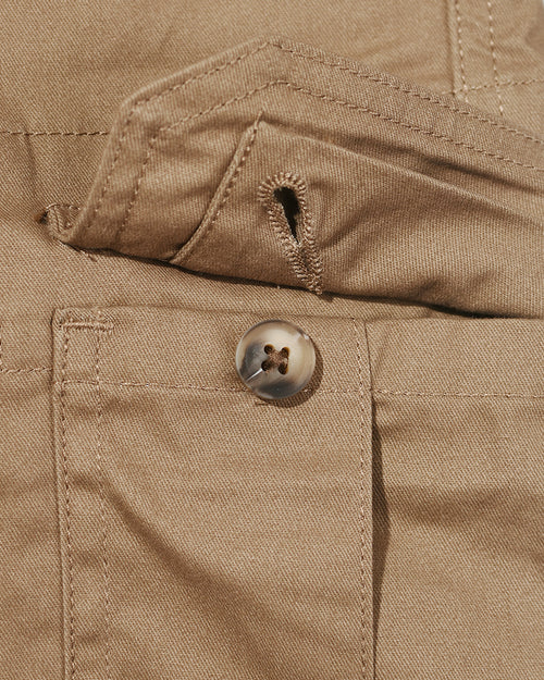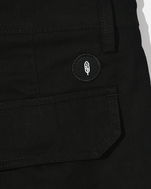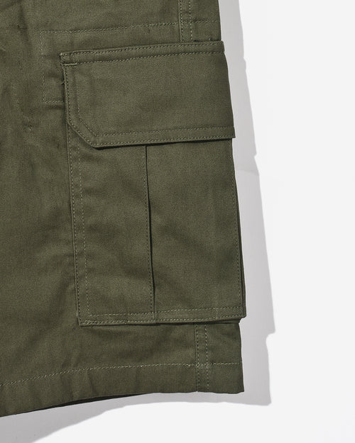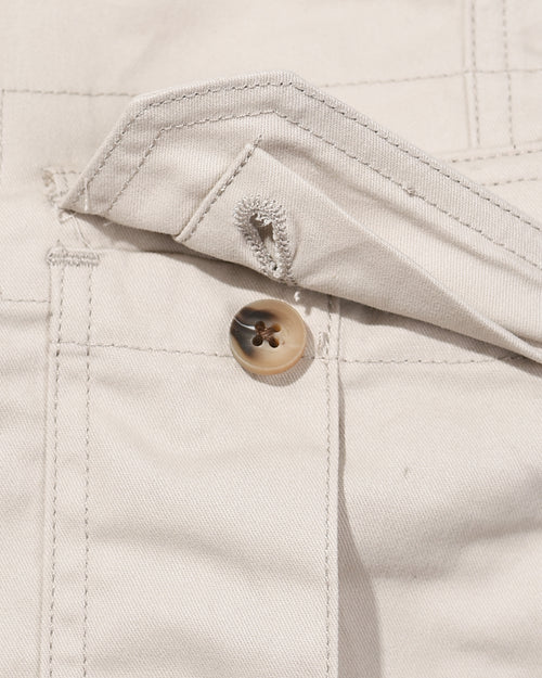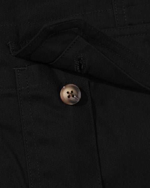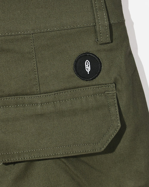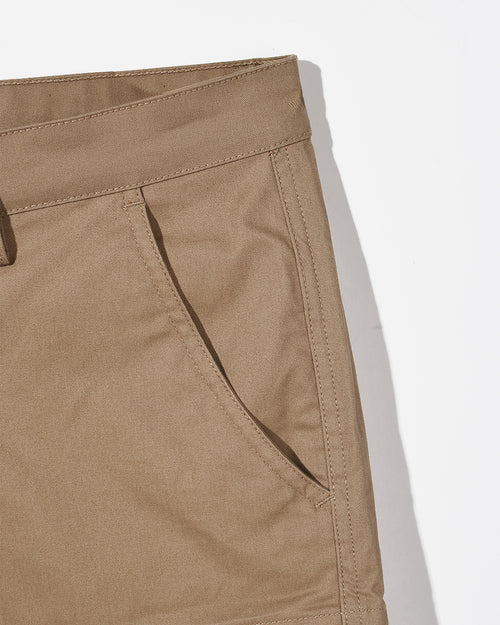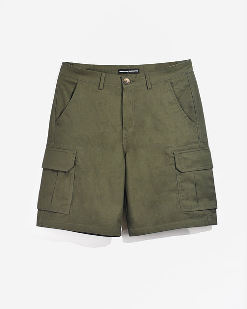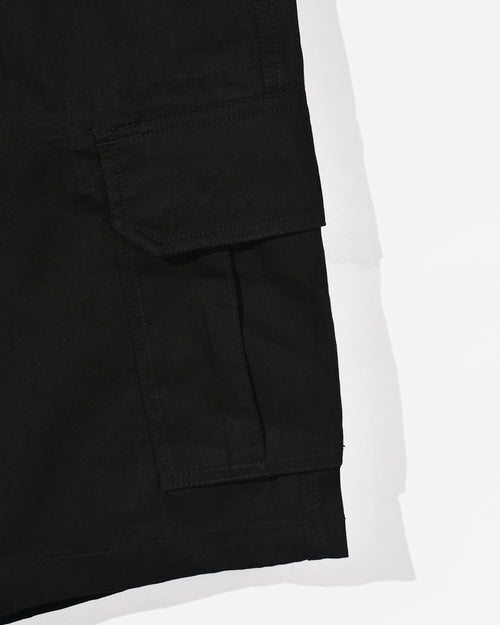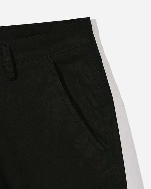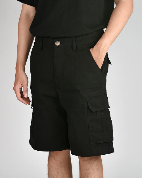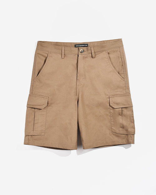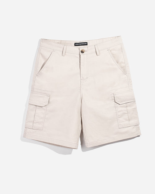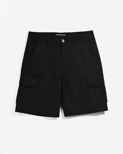 Reguler fit cotton twill shorts cargo in black, army, mocca, cream. Cargo-pocket styling. Zip-fly. Tonal stitching.