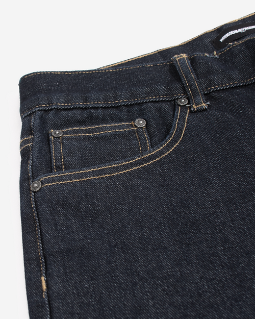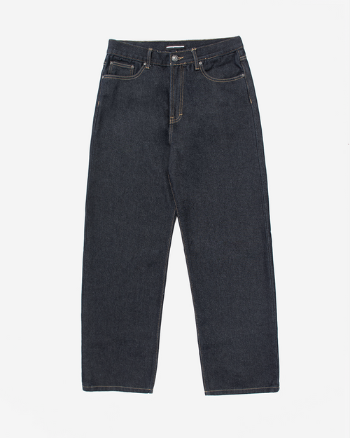 Loose-fit non stretch denim jeans in dark blue. High-rise. Five-Pocket styling. Zip fly. Brown patch leather with embossed logo at the back. Black-tone hardware. Tonal stitching. 100% Cotton. Made in Indonesia.
