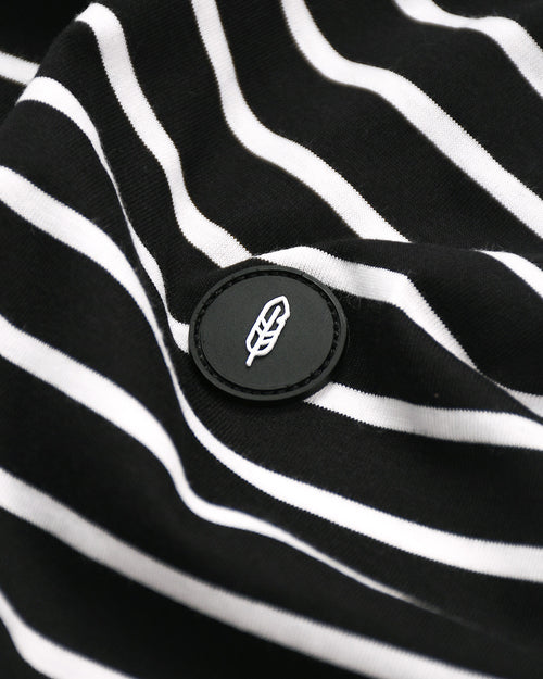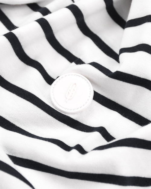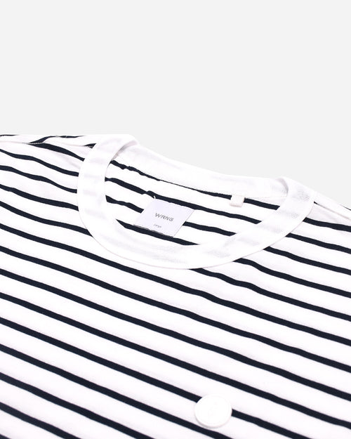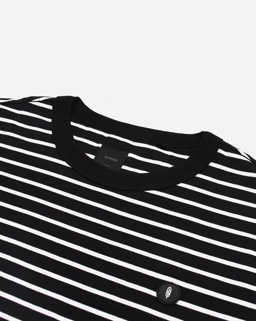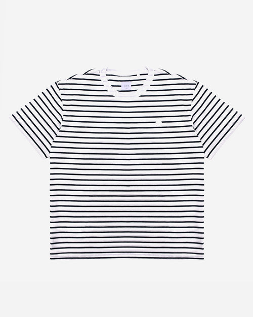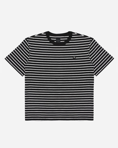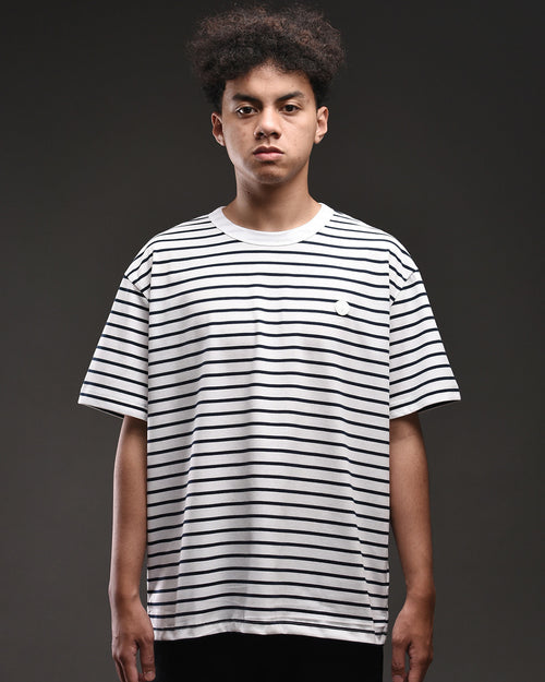 Prewashed short sleeve stripes cotton jersey t-shirt in Black White & White Navy. Rib knit crewneck collar. Signature logo at chest. Tonal stitching. 70% Cotton 30% Polyester. Made in Indonesia.